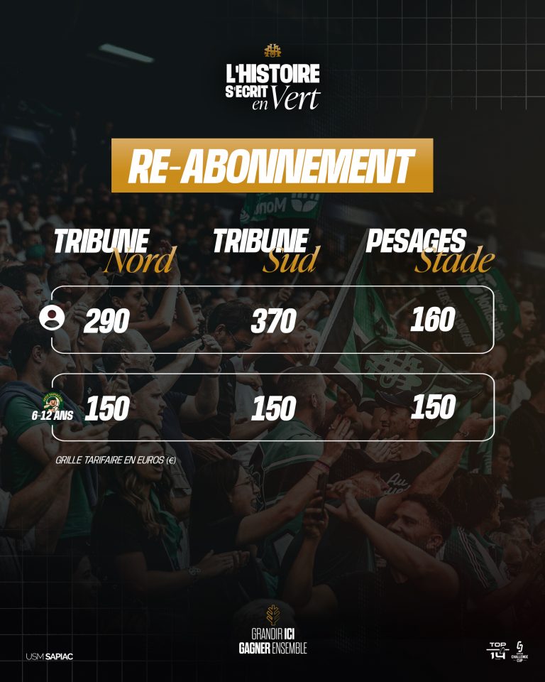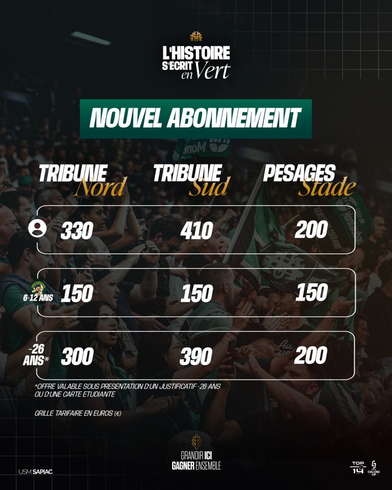Nouvel Abonné : Début de la campagne d'abonnement le 28 Juillet 2025. Permanence au stade et billetterie en ligne sur notre site www.usmsapiac.fr/billetterie